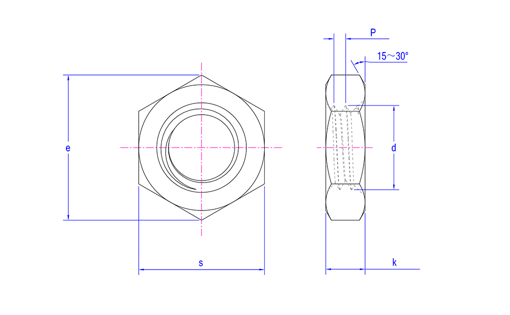 | Charakterystyka wyglądu | Kształt: Sześciokątny z sześcioma symetrycznymi bokami, umożliwiający łatwe dokręcanie i zdejmowanie za pomocą klucza lub innych narzędzi. Taka konstrukcja zapewnia większą wygodę obsługi w ograniczonych przestrzeniach. Grubość: W porównaniu do standardowych nakrętek sześciokątnych jest cieńsza, klasyfikowana jako cienka nakrętka. Jest stosunkowo lekki i zajmuje mniej miejsca. Obróbka powierzchniowa: Zwykle zachowuje naturalny kolor stali nierdzewnej z metalicznym połyskiem. Można go również poddać pasywacji, polerowaniu lub innej obróbce powierzchni, jeśli jest to konieczne, aby zwiększyć odporność na korozję i estetykę. |